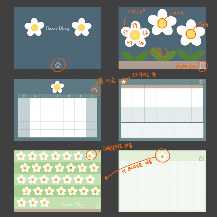 하이퍼링크 다이어리 이며 Month/ Week / Day로 구성되어있습니다.